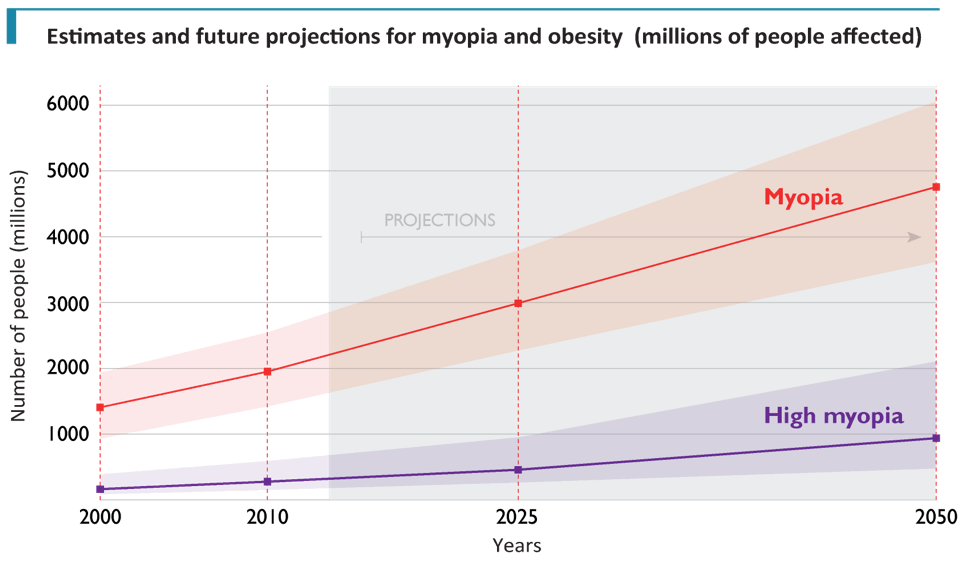 By 2050, it has been projected that the number of people affected by myopia will more than double to a staggering 5 billion, or one in every two persons. High myopia will affect three times more people than current levels, such that more than 1 billion will have pathological myopia, and be at significant risk of blindness.