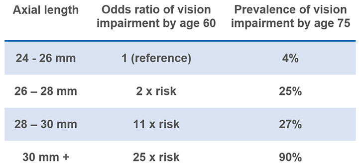 Odds ratios can be a little difficult to interpret and integrate into our discussions with patients when recommending myopia control. A patient might ask “What does ten times higher risk actually mean?”. Some clarity has been provided by researchers in the Netherlands who evaluated the prevalence of vision impairment in relation to axial length. The prevalence of vision impairment by age 75 was seen to increase substantially with increasing eye size. Among people with the longest eyeballs (over 30mm), vision impairment was almost universal, with 90% of the population affected (see Figure 2). Among people with axial length between 26-30mm, around one in every four suffer vision impairment by age 75, with those in the 28-30mm range developing vision impairment at a younger age typically compared to those in the 26-28mm range. The message is simple and clear: slowing down the abnormal growth of the eye which is characteristic of progressive myopia is hugely important for reducing risk of vision impairment.