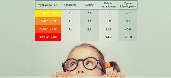 Epidemiologists have also compiled an impressive array of data indicating that myopia is a highly important and an independent risk factor for a range of ocular diseases (see Figure 1). For certain conditions such as retinal detachment and myopic maculopathy, myopia appears to be the dominant risk factor and for others, e.g. cataract and glaucoma, it is second only to age. There is no “safe” level of myopia, and even low myopia causes structural changes which put patients at increased risk of vision loss. Using odds ratios, which describe the increased risk associated with being myopic relative to not having the condition, the table below shows that even 1D of myopia doubles or trebles the risk of disease, while -3.00D to -5.00D carries up to 10 times the risk of serious complications. The increased risks associated with high myopia, particularly for retinal detachment and myopic maculopathy are simply staggering.