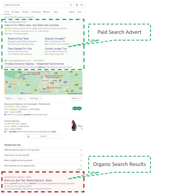 See the example in figure 2. The search term used was ‘opticians eye test.’ The top three returned listings were all paid ads.
