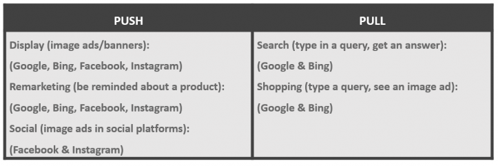 - Google Ads – (formally Adwords) contains Search, Display, Remarketing, Shopping & Youtube ads.