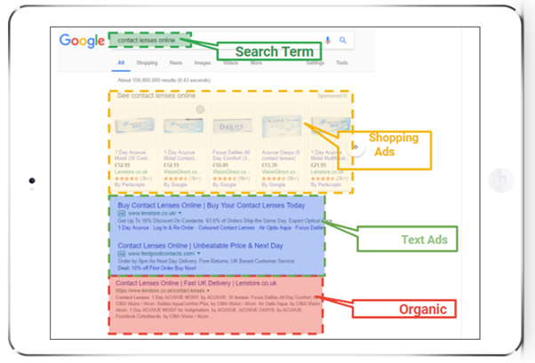 PULL PPC adverts operate based upon the consumer asking a question or “search query”. For example, entering ‘optician near me’ or ‘buy glasses online’ into the Google search bar. This will then bring back a series of both paid and non-paid results relevant to the search query.