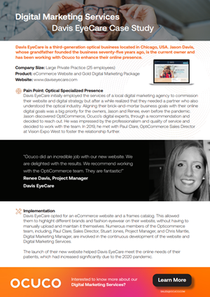 Davis EyeCare has been using Ocuco’s Digital Marketing Services since 2019 to align their goals in the digital world, become a strong competitor and improve their visibility among potential local customers.